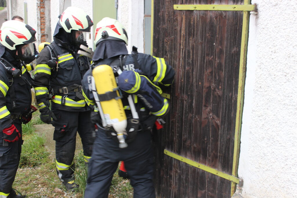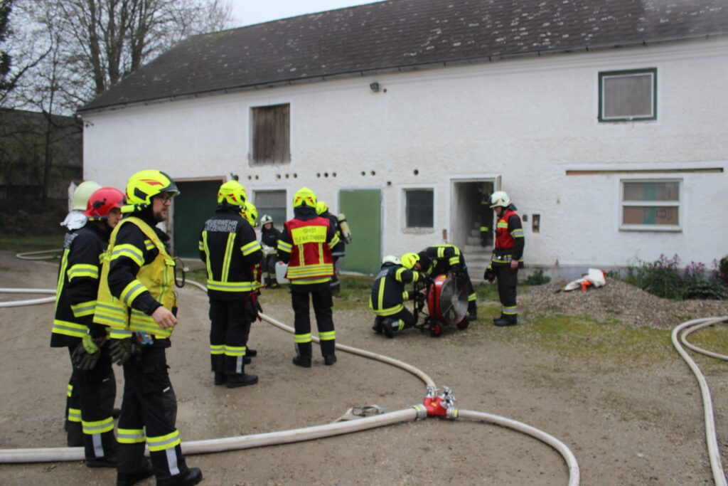 Angenommen wurde ein Brand in einem landwirtschaftlichen Objekt: Eine Feier wurde durch eine Explosion abrupt beendet, wodurch es zu einem Brandereignis kam. Im Gebäude befanden sich insgesamt vier Personen sowie gefährliche Stoffe.